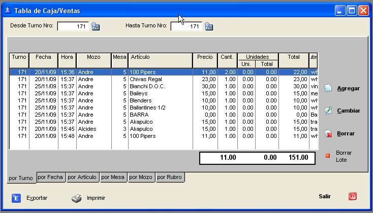 Ventas/Caja, nos muestra el movimiento de consumo dentro de un turno, o entre fechas, por artículos, mesa, mozo, rubro, etc.